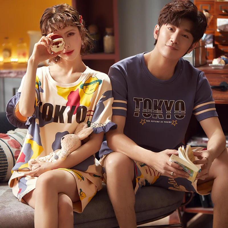 Пижамы женские, мужские, хлопковые, с коротким рукавом и кружевом