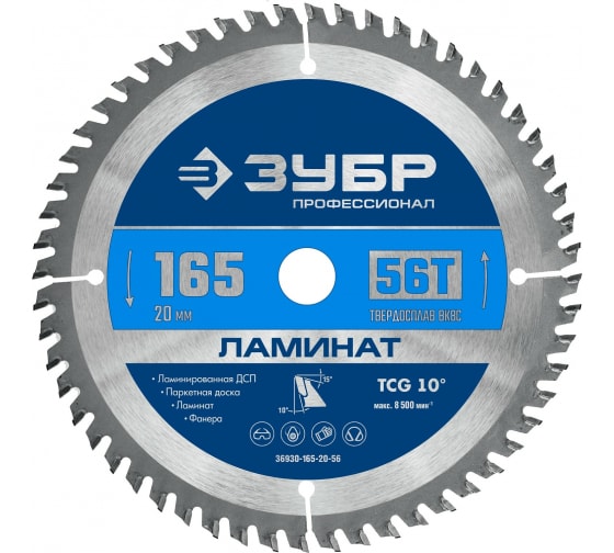 Пильный диск ЗУБР Ламинат, ⌀165 мм x 20 мм ламинат, чистый рез, 56T, 1 шт. (36930-165-20-56)