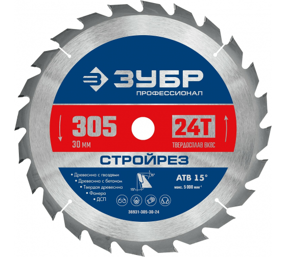Пильный диск ЗУБР Стройрез, ⌀305 мм x 30 мм по дереву, 24T, 1 шт. (36931-305-30-24)