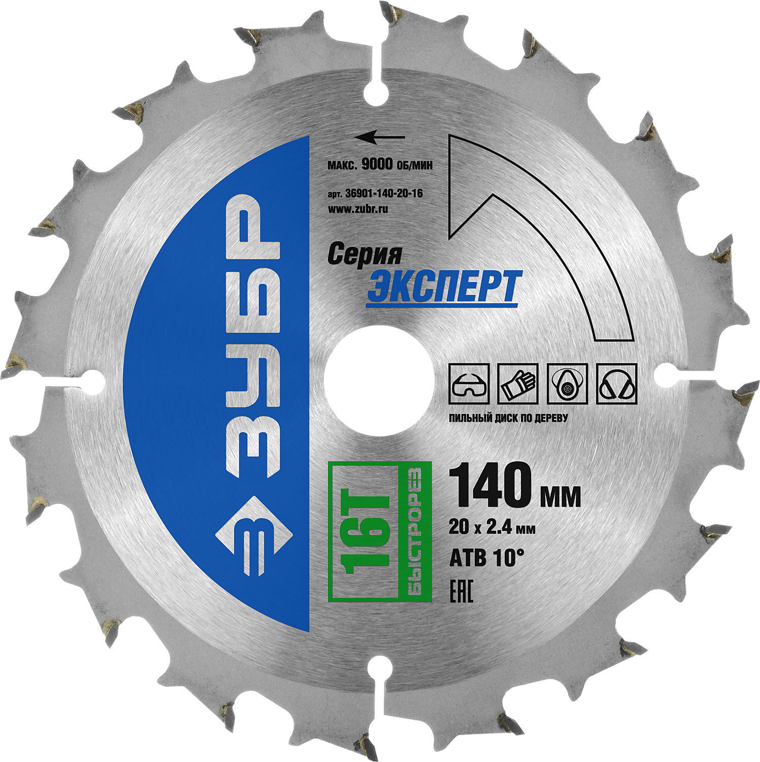 Пильный диск ЗУБР, ⌀140мм x 20мм по дереву, быстрый рез, 16T, 1шт. (36901-140-20-16)