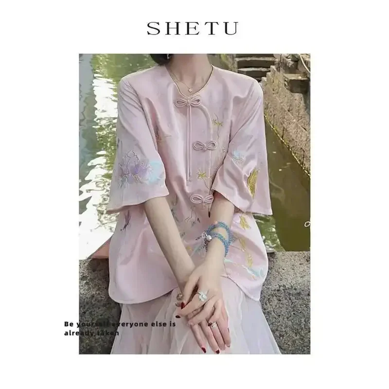 DY20Новый китайский стиль дзен розовый жаккардовый костюм с лягушкой на пуговицах Тан для женщин, летняя новая свободная рубашка с круглым вырезом в национальном стиле25