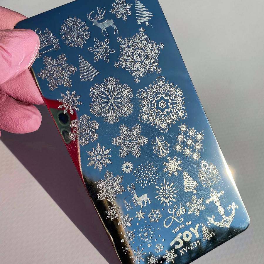 Пластина изготовлена из прочного металла. Она гладкая и блестящая, что позволяет наносить высокоточные рисунки с идеальной проработкой даже самых мелких деталей рисунка. Рисунки можно комбинировать, наносить их разными цветами лаков, добавлять стразы, жемчуг, бульйонки, а также любые другие декоративные элементы.