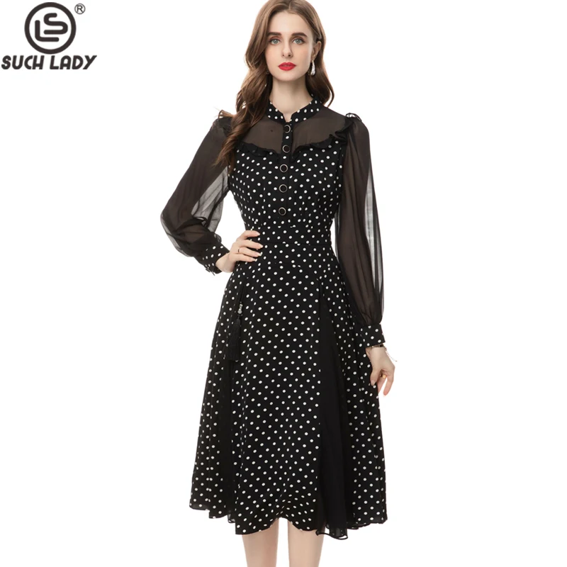 Женские модельные платья с воротником-стойкой, модные повседневные Лоскутные платья в горошек с длинным рукавом