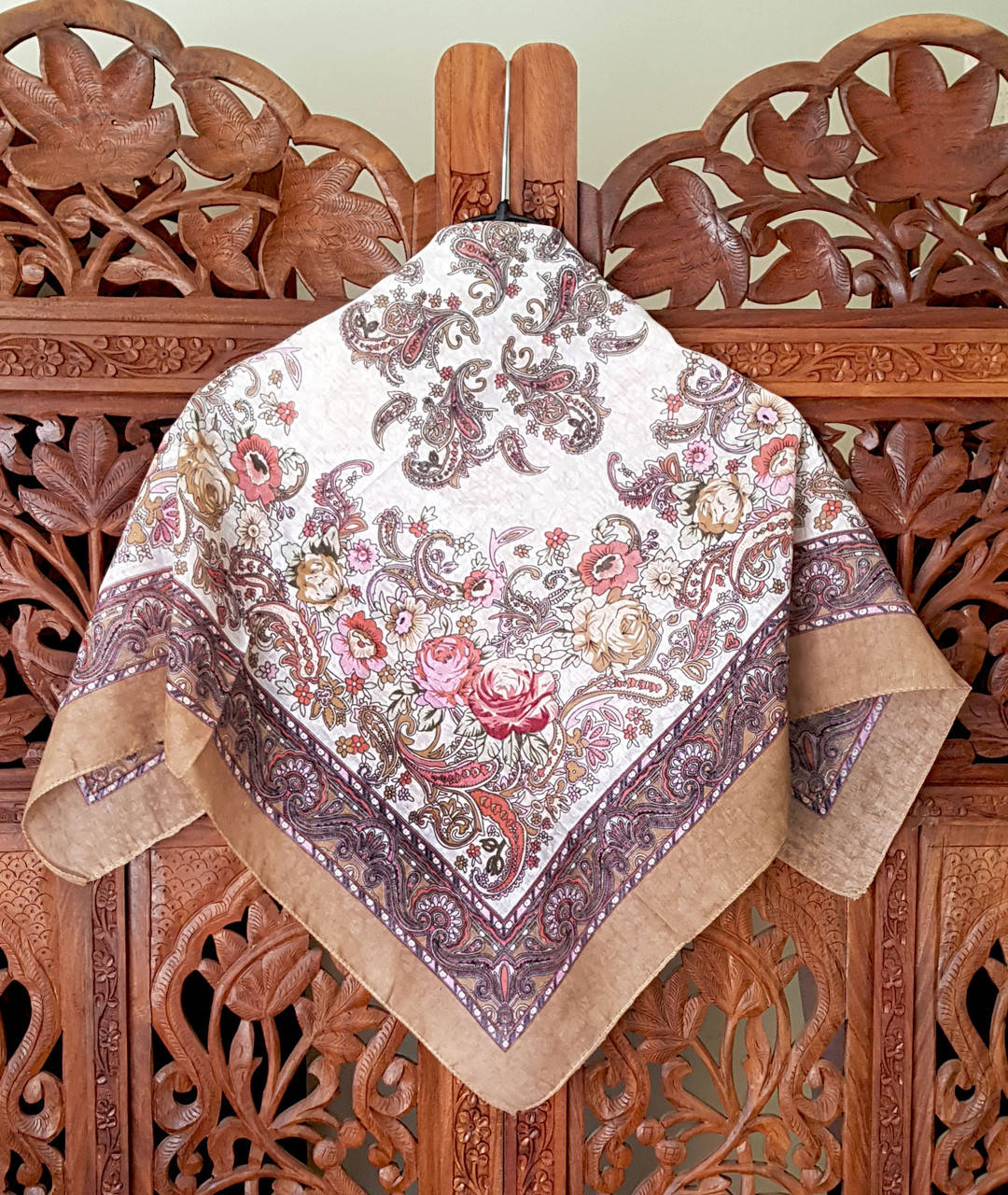 Платок средний головной из приятного, мягкого поликоттона с набивным рисунком, размер 72*72 см. Нежные цветочные узоры, приятные тона.
