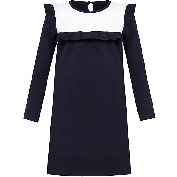 Классическое прямое платье отлично подойдет в качестве школьной формы. Платье декорировано рюшами, что придает простому крою оригинальности. Благодаря материалу ткани и крою изделие будет комфортным и удобным в носке.