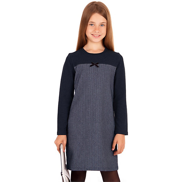 Трикотажное платье школьное Апрель с круглым вырезом горловины и длинными рукавами. Одевается через голову, не имеет застежек. Девочке будет удобно и комфортно в школе в таком стильном платье от российского бренда Апрель.