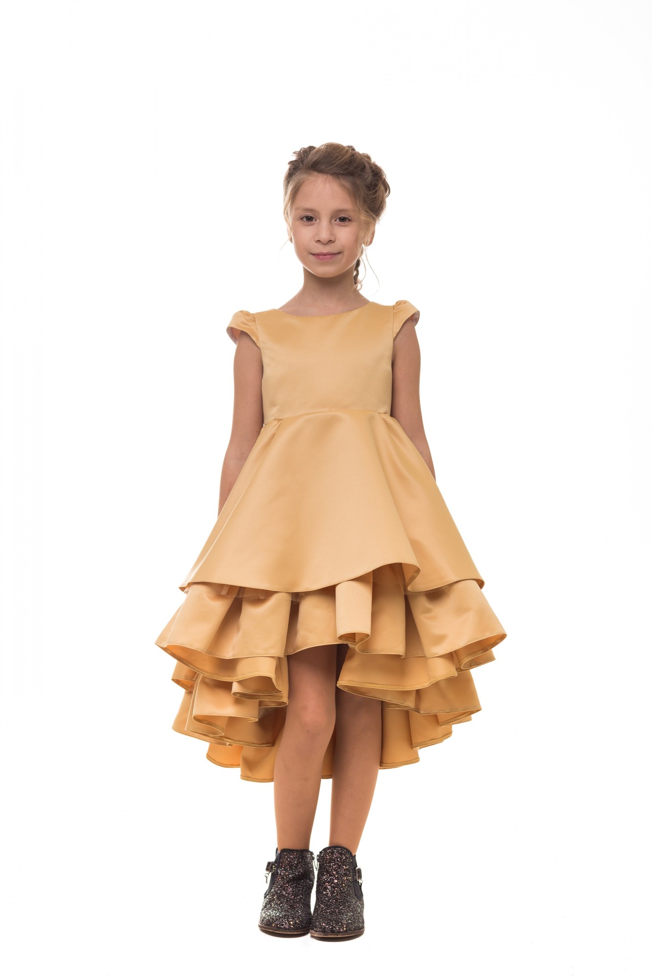[html]Платье «Волан» золотистого цвета — это та вещь, которая делает вашу красавицу не только счастливой, но и неповторимой. Это нарядное платье прекрасно подойдет вашей красавице на выпускной в садик или на свадьбу.В этом платье ваша кроха будет привлекать взгляд и вызвать улыбки у всех окружающих. А сама принцесса не сможет спокойно стоять на месте, потому что в этом наряде хочется все время танцевать.Основная ткань – полиэстер 100%, подкладка – 100% хлопок.К платью удачно подходят туфельки, удобные балетки и даже трендовые кроссовки или кеды.Доступные размеры платья для девочек в возрасте от 1 года до 12 лет[/html]