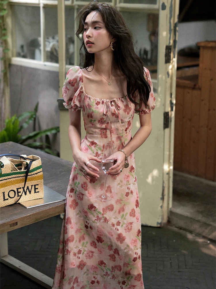 Платье-Макси женское с цветочным принтом, квадратным вырезом и рукавами-фонариками