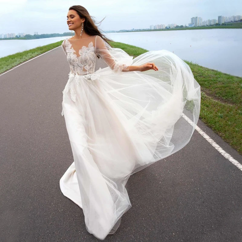Платье Свадебное ТРАПЕЦИЕВИДНОЕ из тюля с длинными рукавами и аппликацией