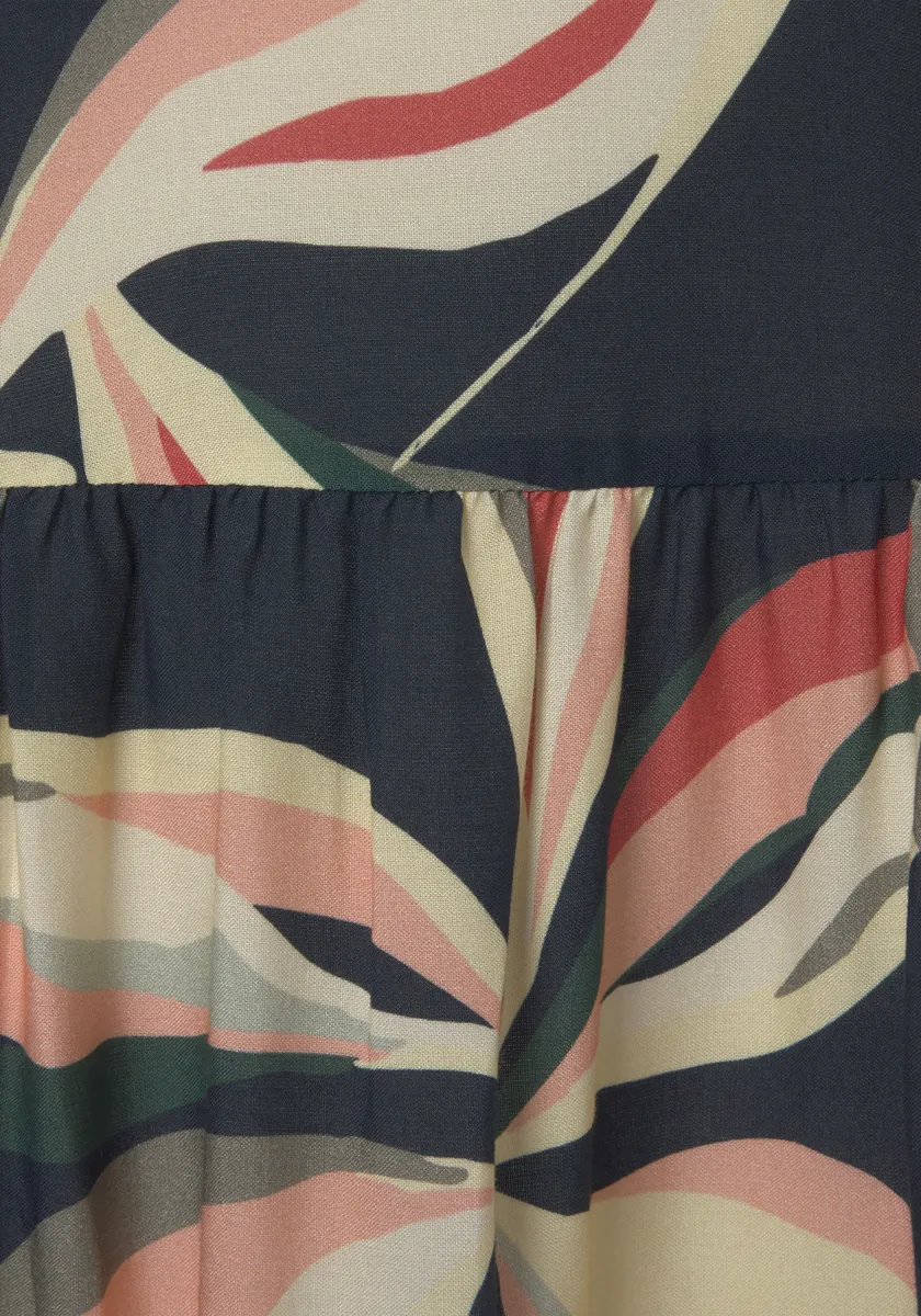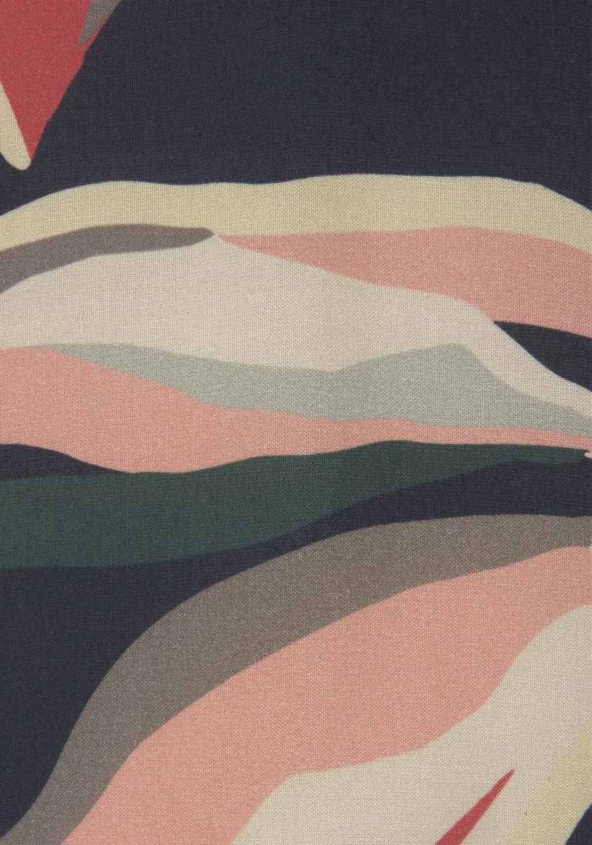 V-образный вырез с планкой Короткие рукава Собирается в области бедер. Облегает фигуру Изготовлен из тканой вискозы.