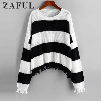 ZAFUL Two Tone Striped Drop Shoulder Sweater Autumn Warm Multi Contrast Women Sweater Asymmetrical Frayed Hems Pullovers Sweater