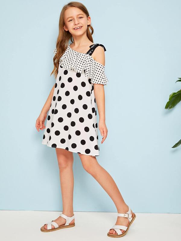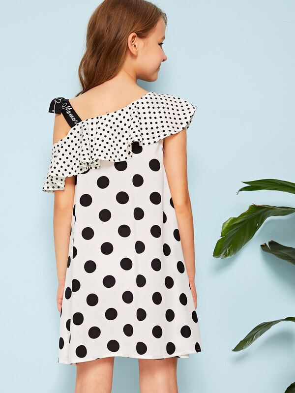 Платье в горошек с оборкой, асимметричным воротником и текстовой лентой для девочек, Sashab