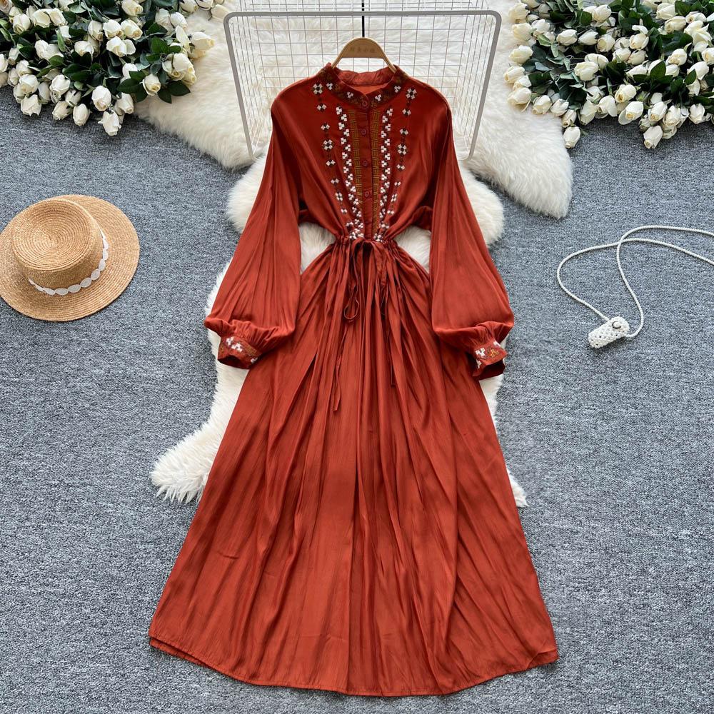 Платье в ретро этническом стиле с тяжелой вышивкой для женщин, модное, с кисточками на талии, приталенное, богемное, драпированное, с большим подолом, пляжное, длинное One Size оранжевый