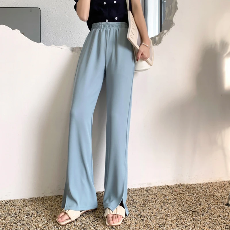 Female Floor-Length Pants Casual Lady Trousers 2021 Summer Split Straight Pants Women Elastic Waist Loose Wide-Leg Pants