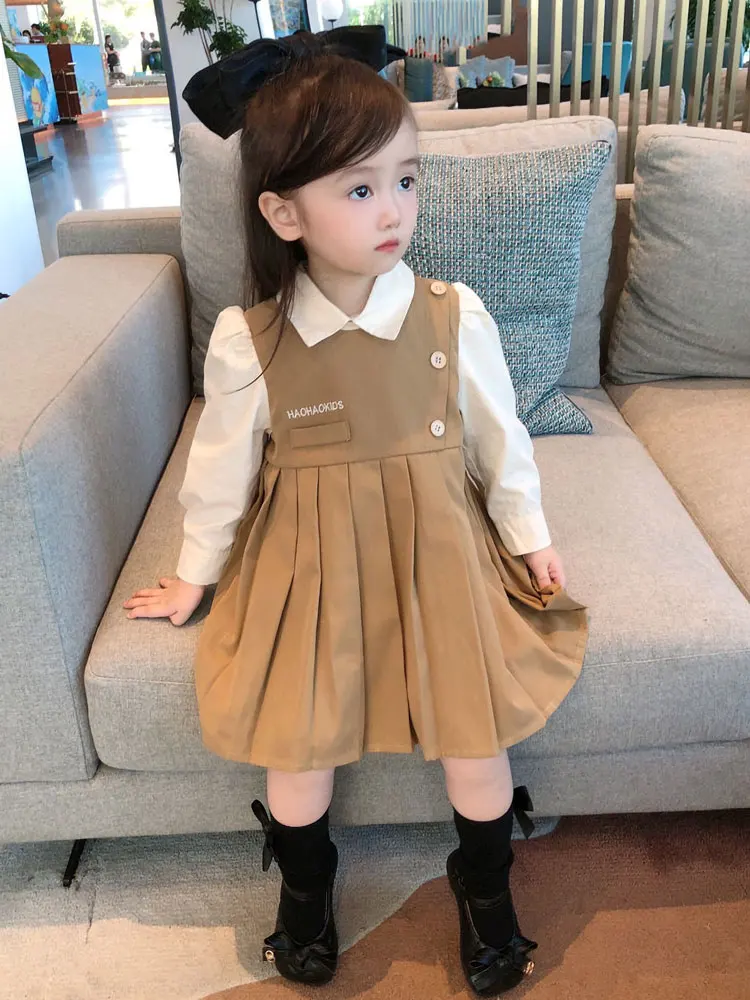 Платье для маленьких девочек, новое студенческое платье в студенческом стиле на весну и осень, платье с длинным рукавом и бантом, плиссирова...