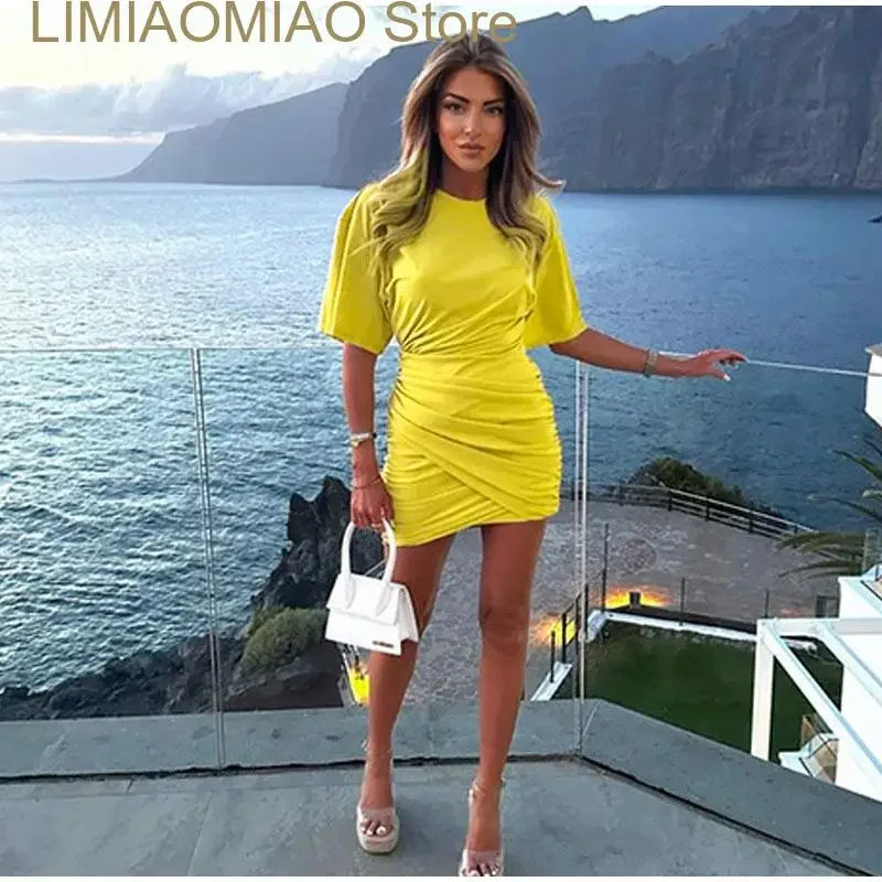 Платье женское Плиссированное с коротким рукавом и круглым вырезом