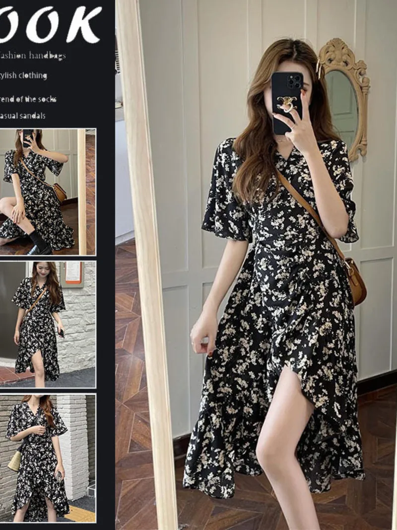 Платье женское ТРАПЕЦИЕВИДНОЕ средней длины с разрезом и цветочным принтом