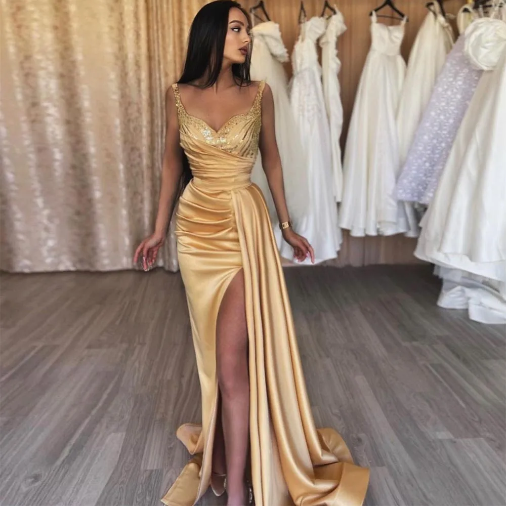 Платье женское вечернее атласное Плиссированное с высоким разрезом, V-образным вырезом и оборками