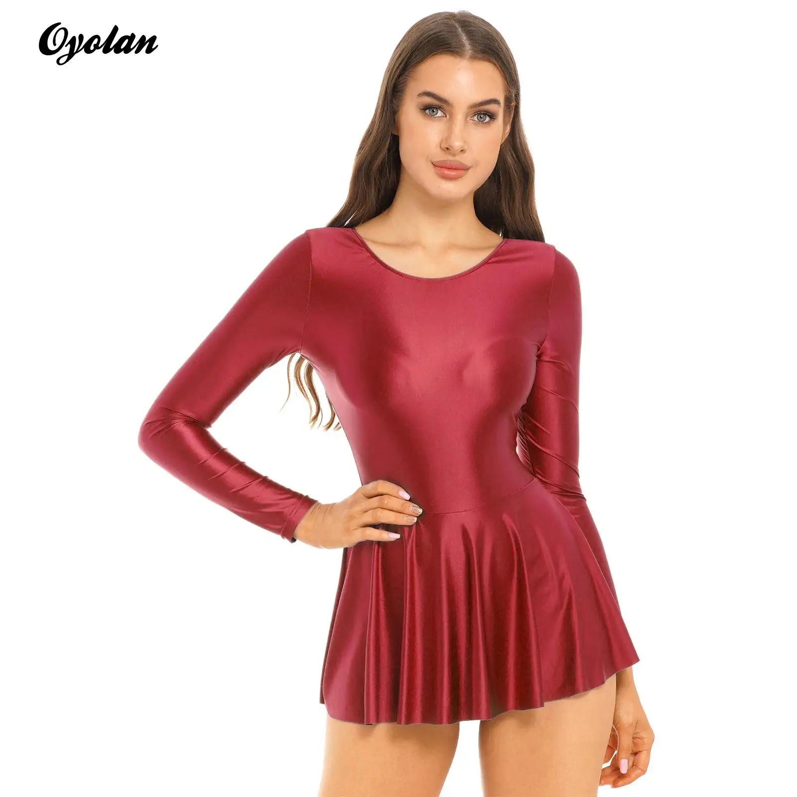 Платье женское глянцевое однотонное с длинным рукавом, воланом и круглым вырезом