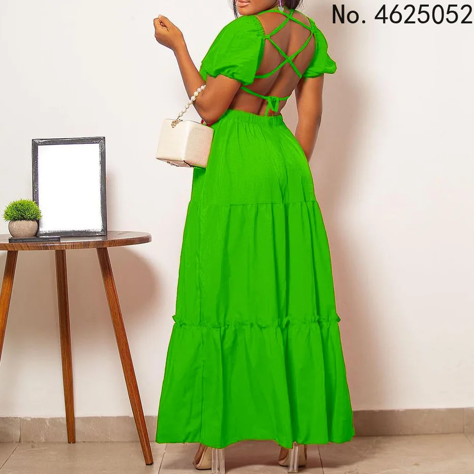 Платье женское длинное из полиэстера с V-образным вырезом и коротким рукавом