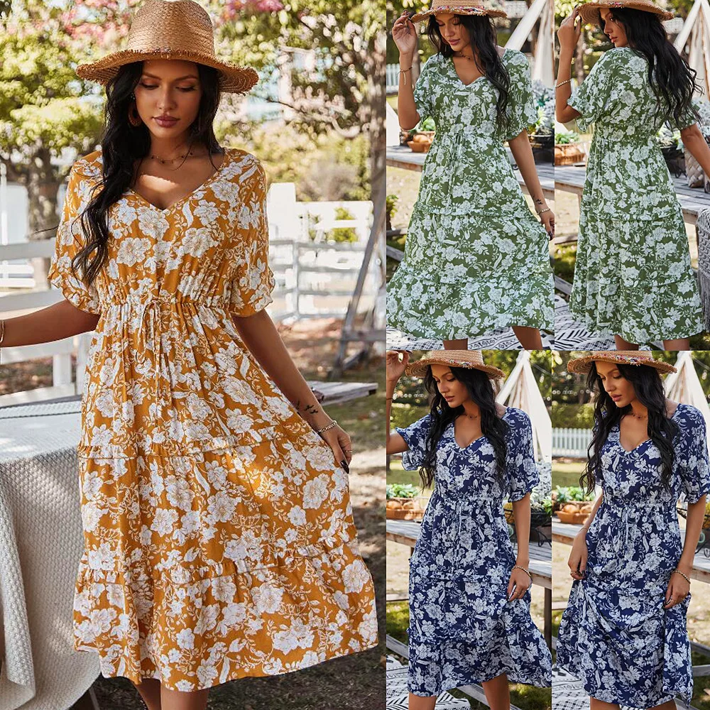 Платье женское длинное пляжное с цветочным принтом и V-образным вырезом