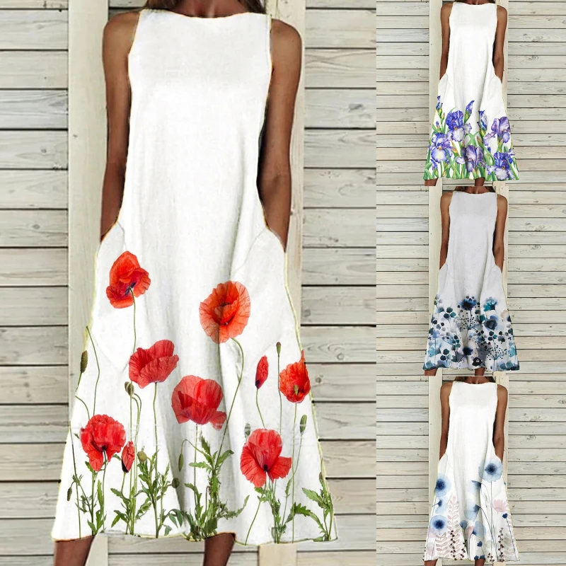 Платье женское длинное с круглым вырезом, модное свободное винтажное праздничное платье без рукавов, с карманами и принтом, лето 2021