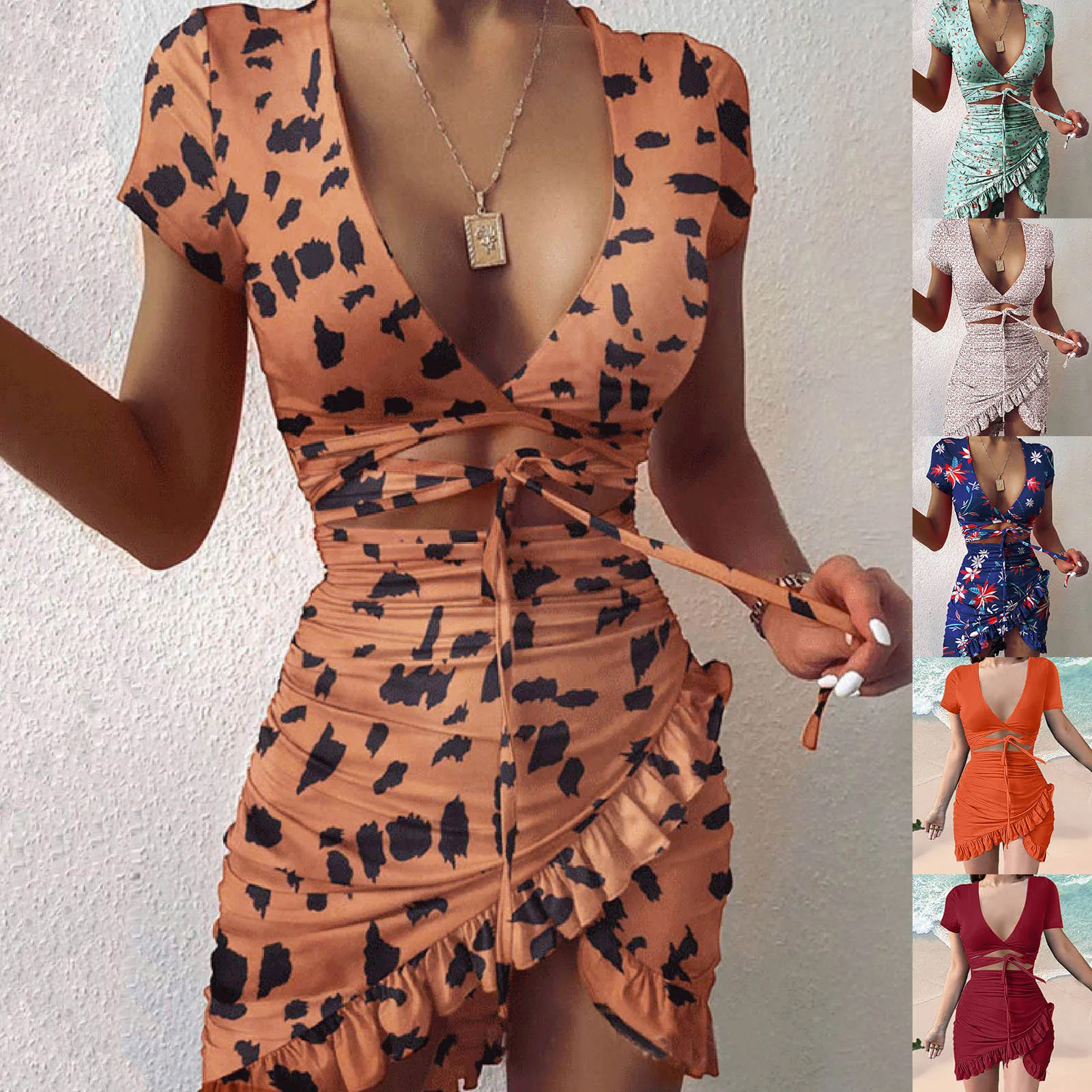 Платье женское длинное с оборками, повседневное приталенное с V-образным вырезом и разрезом, с цветами, с завязками, с оборками