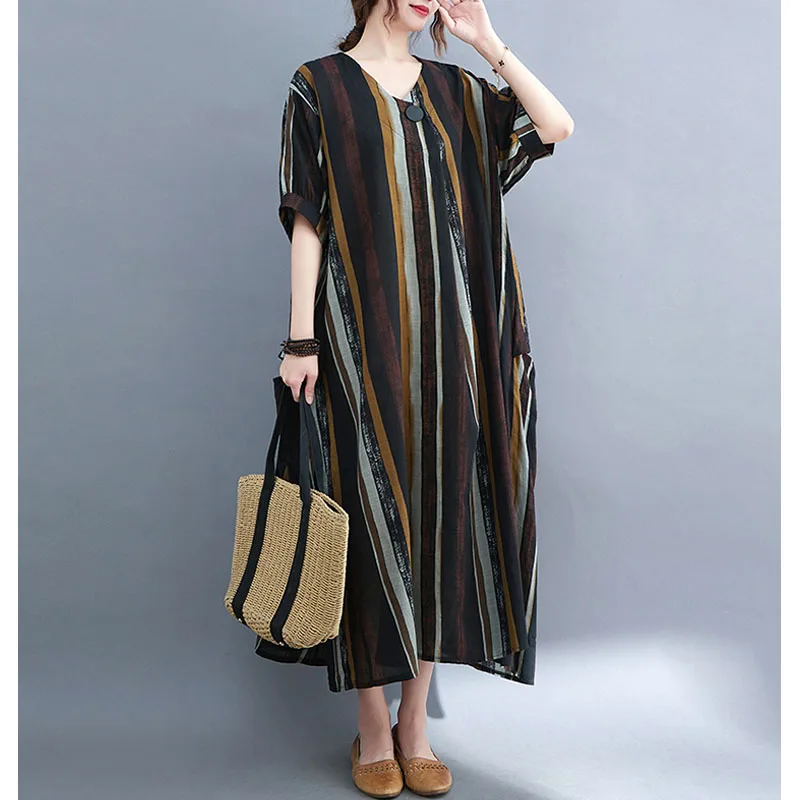 Платье женское длинное хлопковое с V-образным вырезом и коротким рукавом