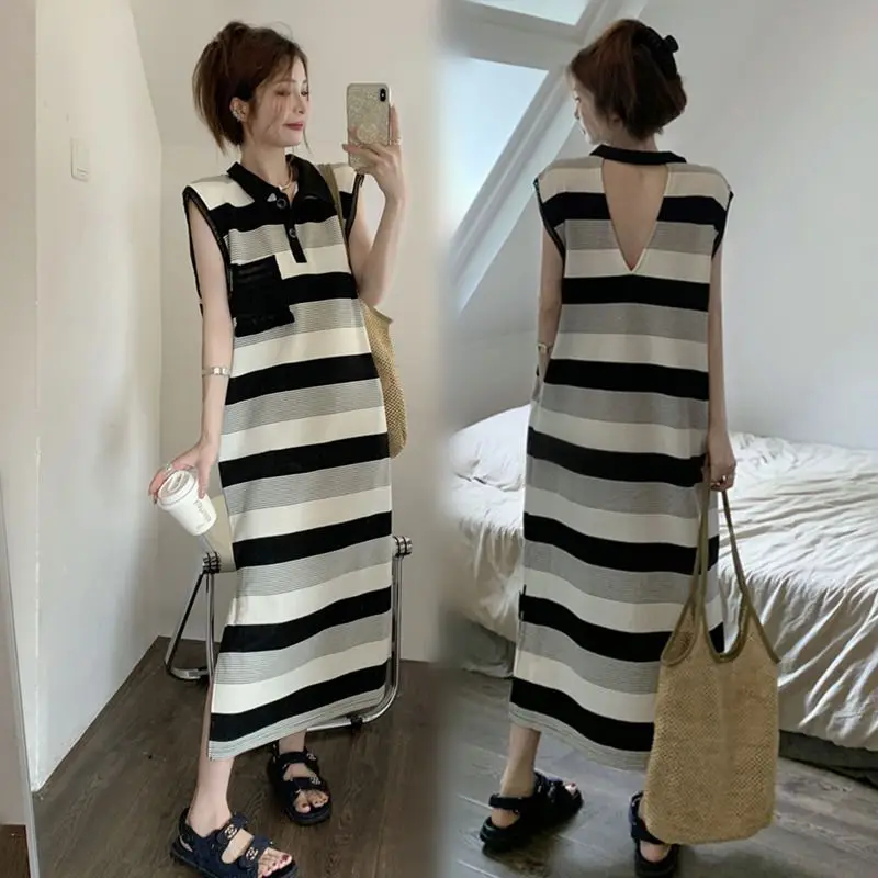 Платье женское контрастное без рукавов, модная уличная одежда в полоску, элегантные платья, черный белый серый, на лето
