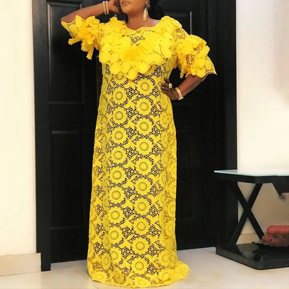 Платье женское кружевное однотонное с круглым вырезом и длинными рукавами