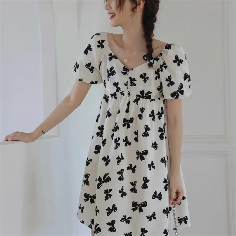 Платье женское летнее, с принтом бабочек, V-образным вырезом и пышными рукавами