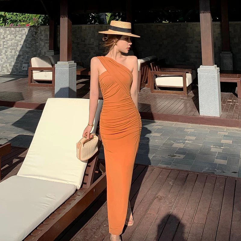 Платье женское на одно плечо, пикантное длинное однотонное вечернее банкетное с открытыми плечами без рукавов