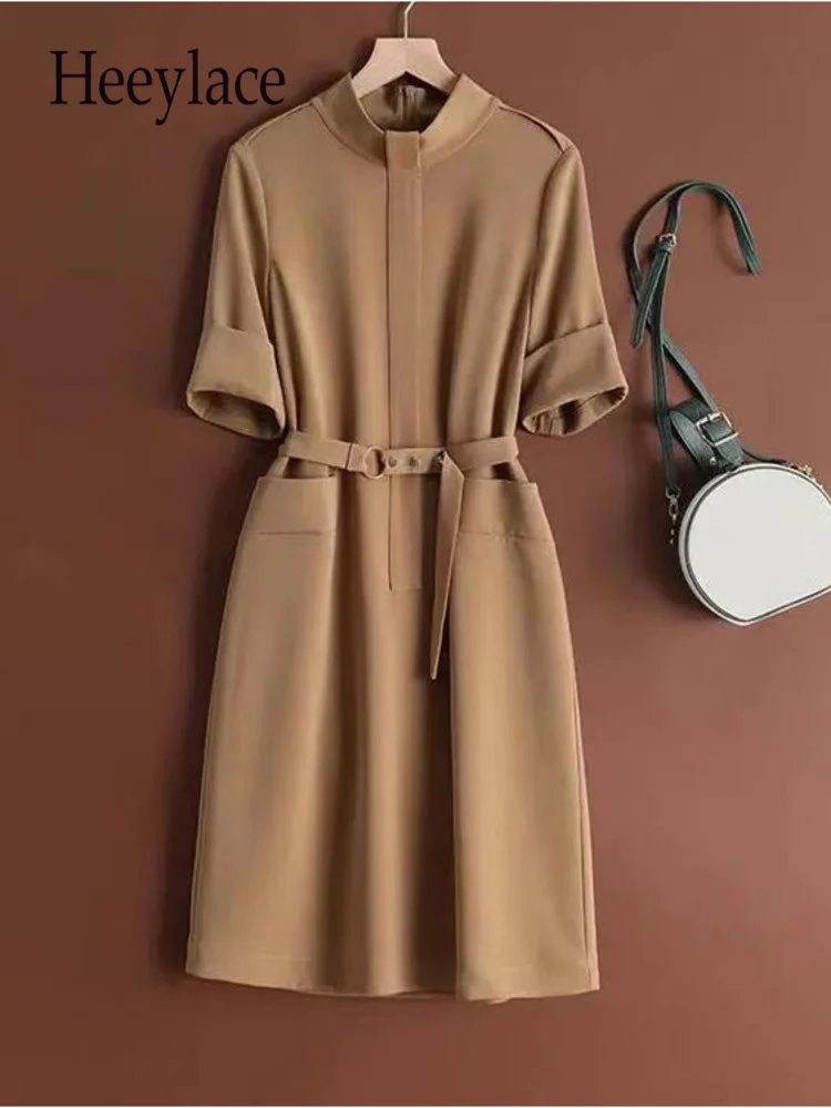 Платье женское однотонное с коротким рукавом, элегантное модное приталенное офисное, с высоким воротником, одежда на лето