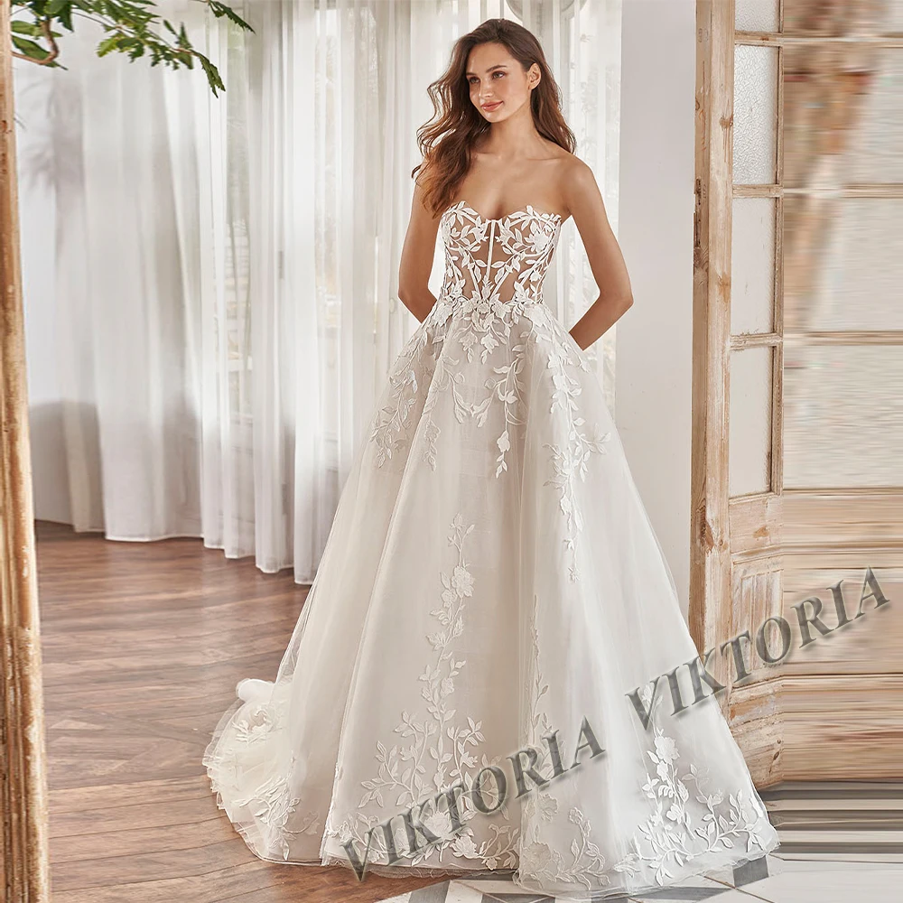 Платье женское свадебное ТРАПЕЦИЕВИДНОЕ, без бретелек, с аппликацией