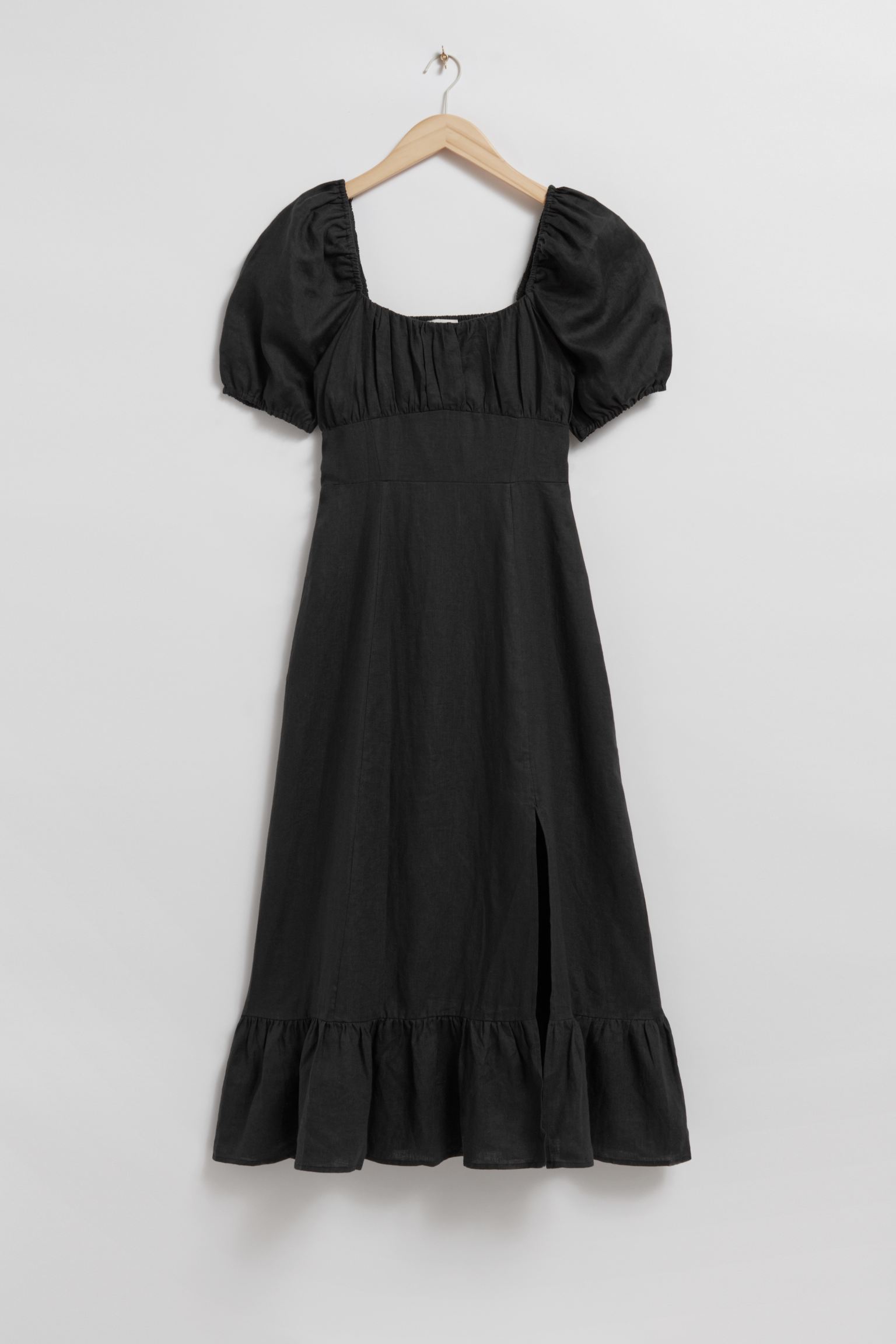 Данный товар доставляется из Германии.При выборе ориентируйтесь на европейский размер производителя! Льняное платье миди с короткими рукавами-фонариками, оборками по низу и разрезом сбоку. Сборка сзади. Длина платья: 89,5 см (ЕС 36/Великобритания 10/США 4). На модели: ЕС 36/Великобритания 10/США 4. Рост модели: 175 см.