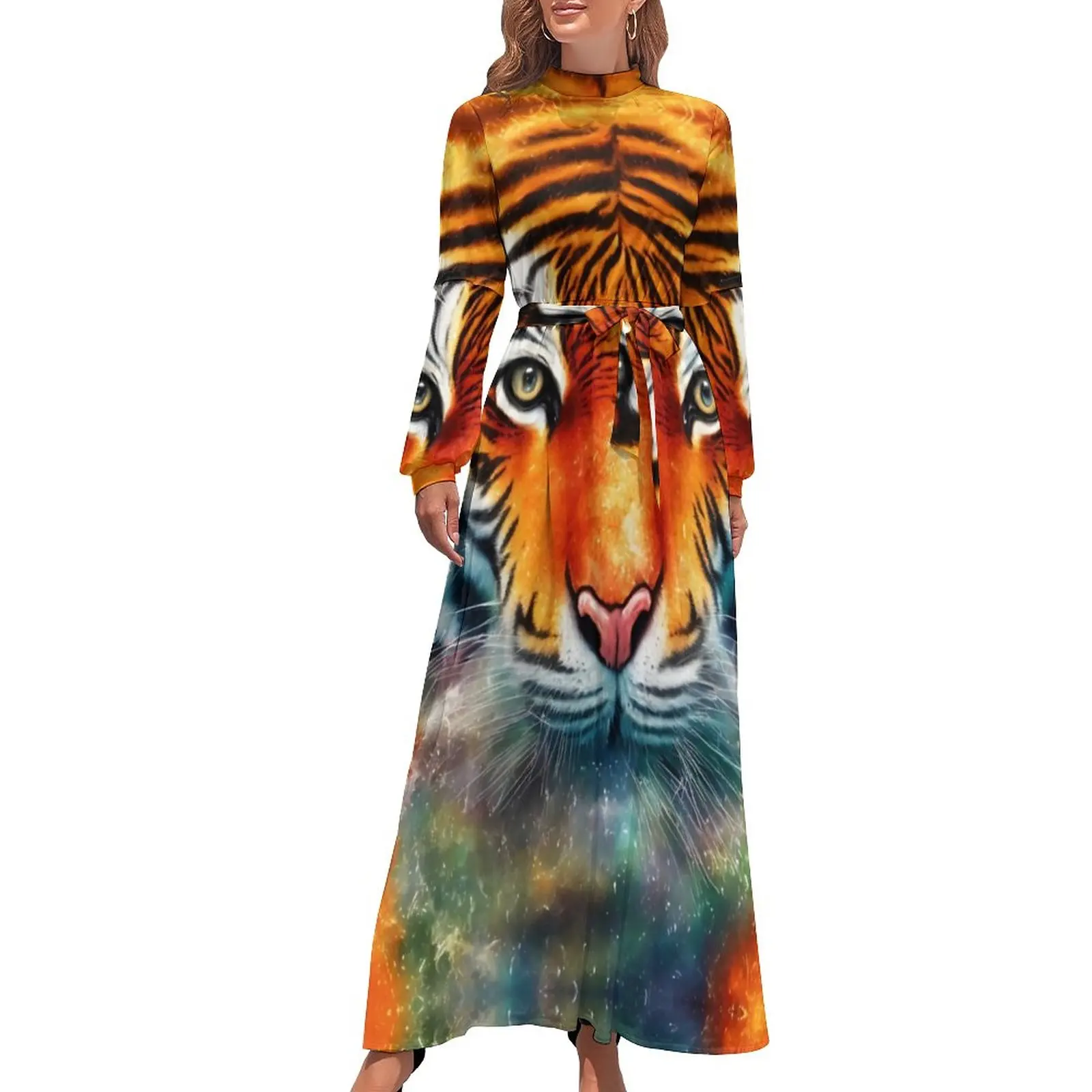 Платье-макси в стиле бохо женское, длинное пляжное платье с принтом тигра и льда и снега, с длинным рукавом, с завышенной талией