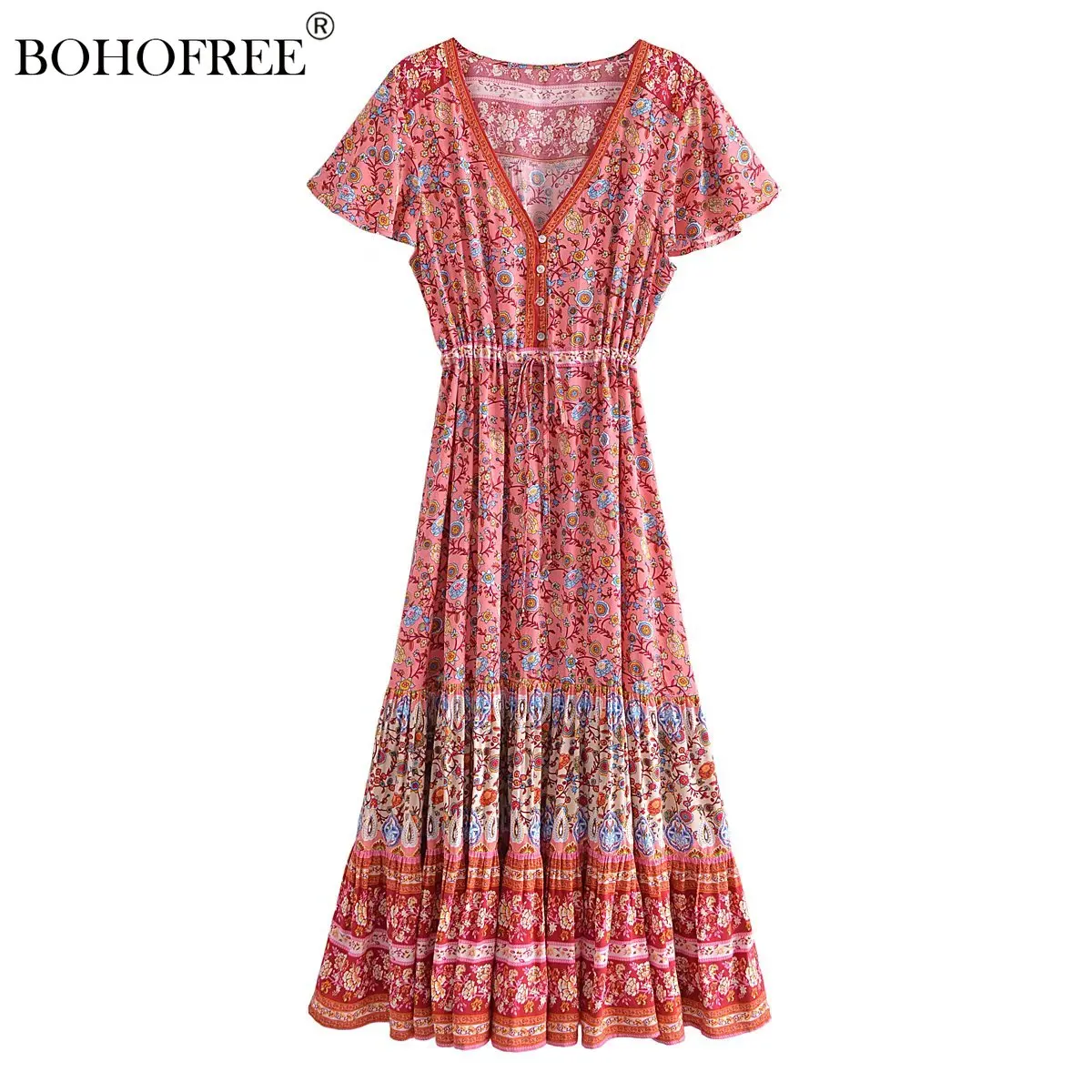 Платье-макси в стиле бохо с V-образным вырезом и коротким рукавом