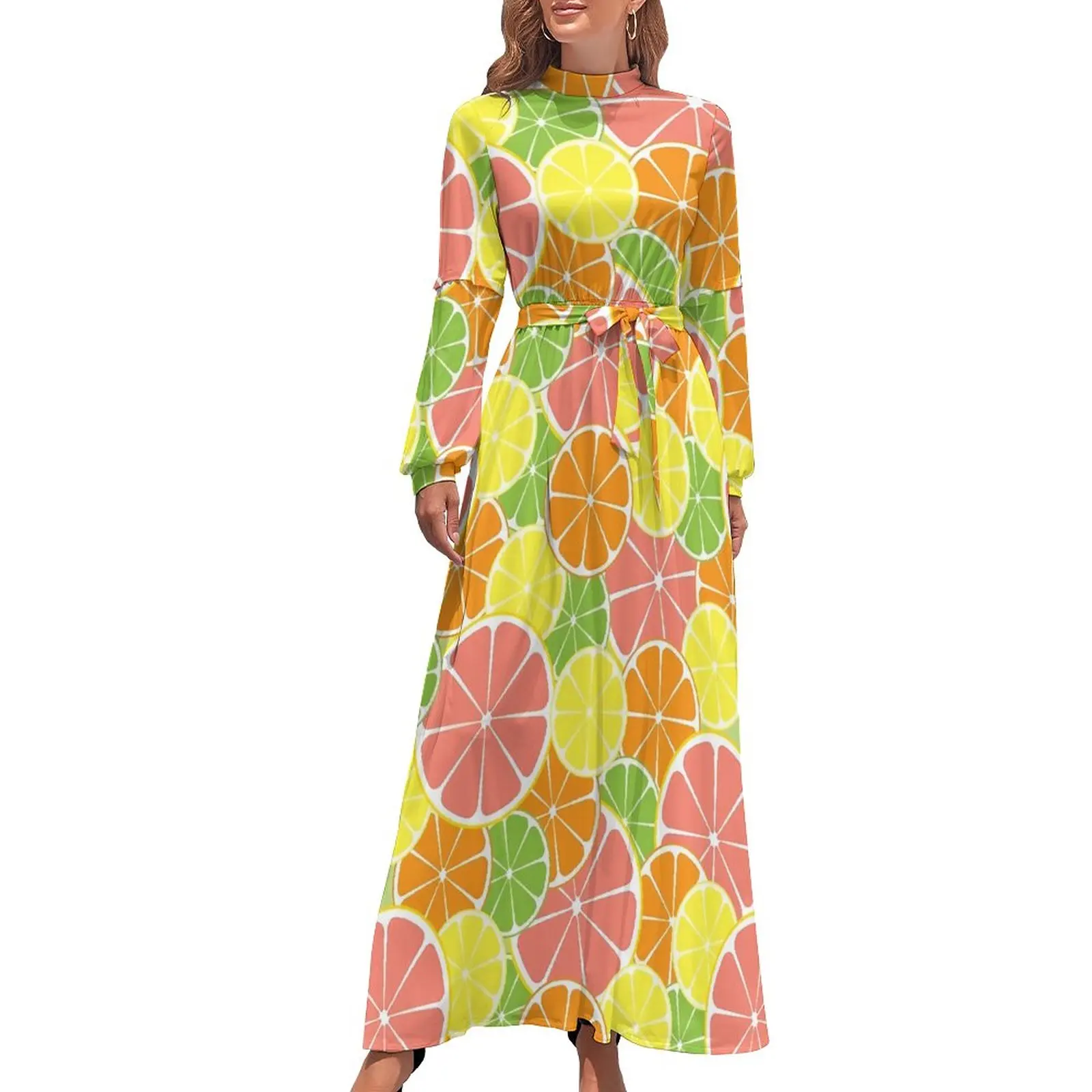 Платье-макси с длинным рукавом, высокой талией и цитрусовым принтом
