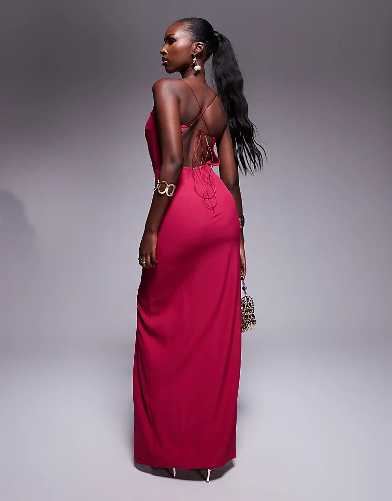 Платье макси с перекрученным спереди и бретельками на спине малинового цвета Vesper