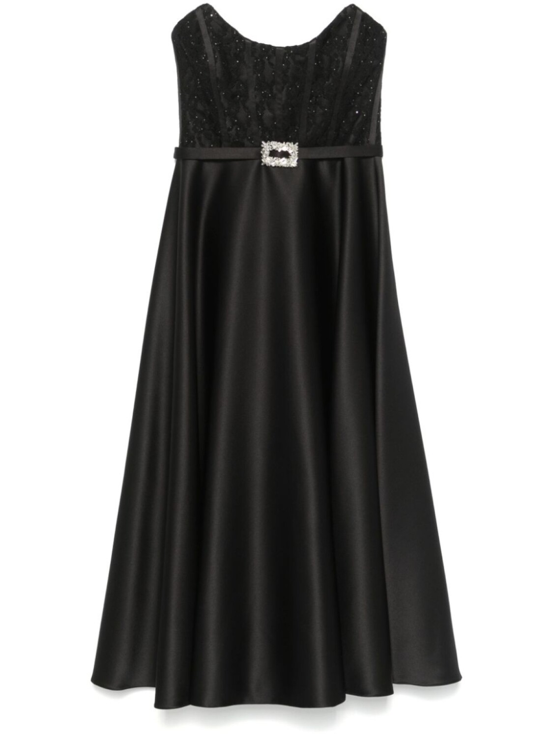 Подробнее о товаре: • черный • кружево/тафта • дизайн со вставками • верх в корсетном стиле • шнуровка сзади • потайная застежка на крючках и молнии сзади • без бретелей • U-образный вырез • пайетки • пряжка с кристаллами • расклешенная юбка • цельная подкладка • прямой подол • длина до середины икры