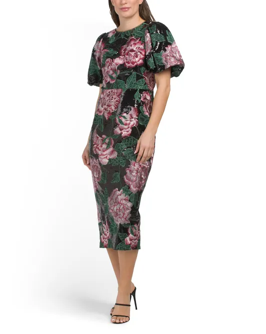 Платье миди с объемными рукавами и пайетками Marchesa Notte, черный