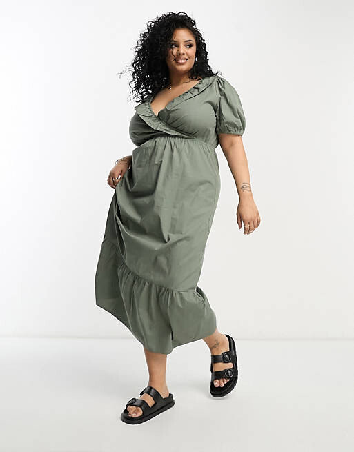 Платье миди цвета хаки из поплина с оборками River Island Plus