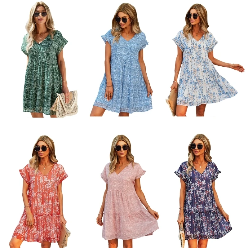 Платье-мини с V-образным вырезом, воланом и цветочным принтом