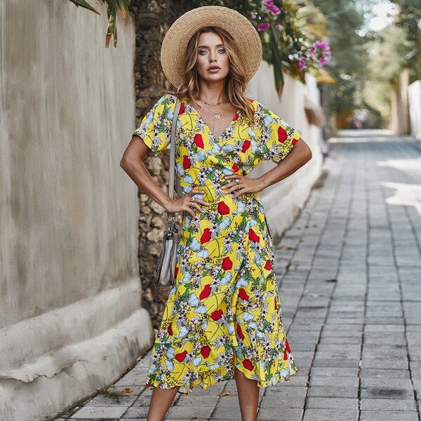 Платье на запах с оборками и цветочным принтом, Жёлтые