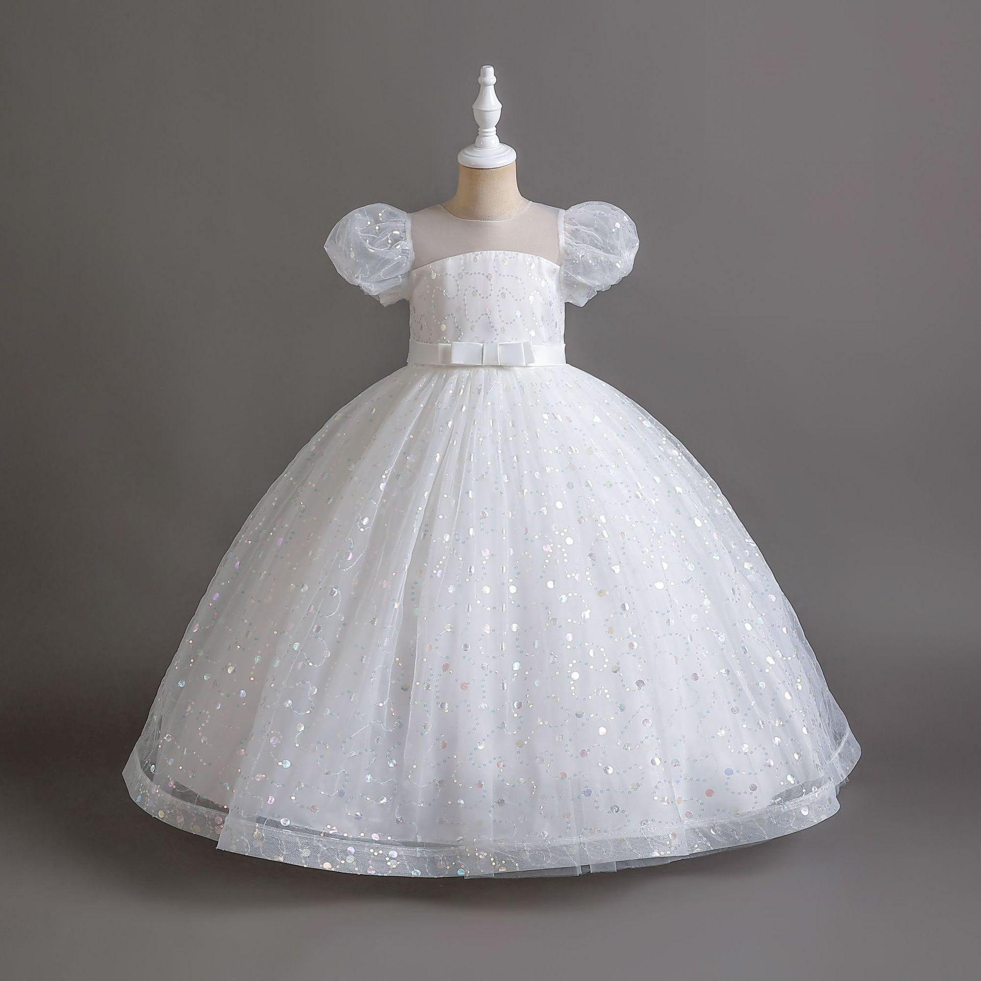 Платье принцессы с пышными рукавами для девочек - Длинная сетчатая пряжа Летний наряд для дня рождения и свадьбы 140 cm белый