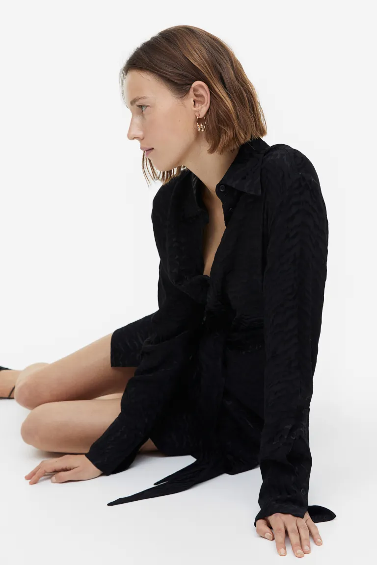 Короткое платье из тканого материала с воротником, пуговицами спереди и двухслойной юбкой с широкими завязками спереди. С длинными рукавами со слегка выраженным спущенным плечом, с разрезами и пуговицами на концах. Без прокладки.