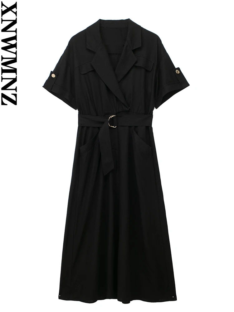 Платье-рубашка XNWMNZ женское с поясом, модное шикарное миди-платье из смеси льна в стиле ретро, с отложным воротником и коротким рукавом