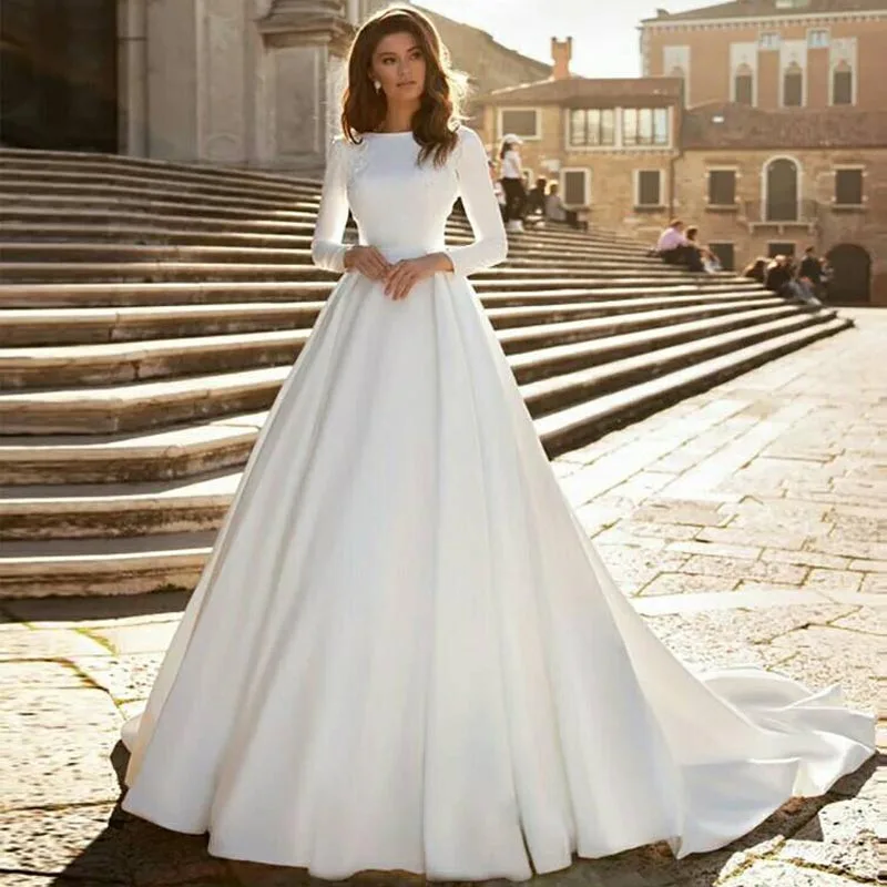 Платье свадебное атласное с длинным рукавом, открытой спиной и аппликацией