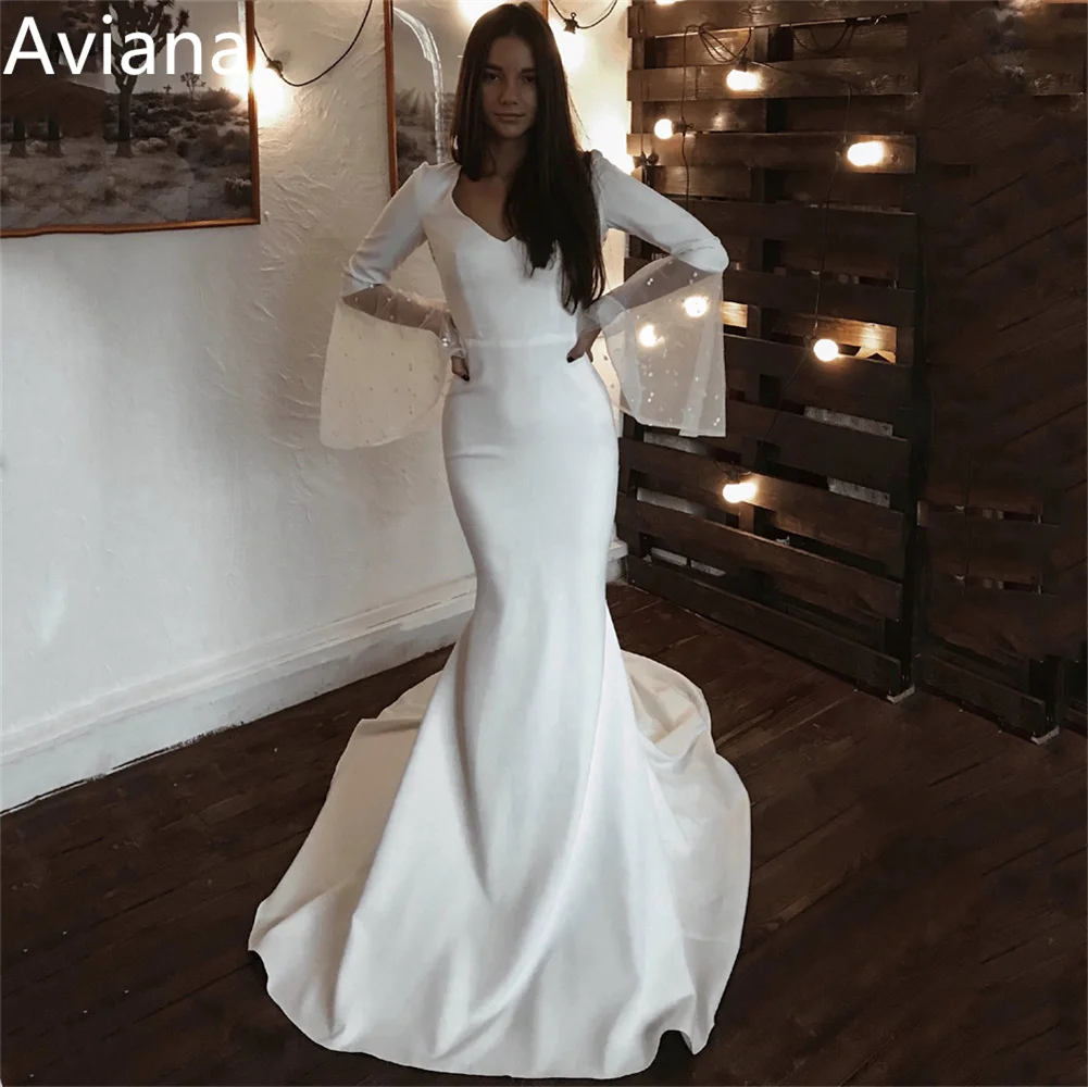 Платье свадебное атласное с V-образным вырезом, длинным рукавом и открытой спиной