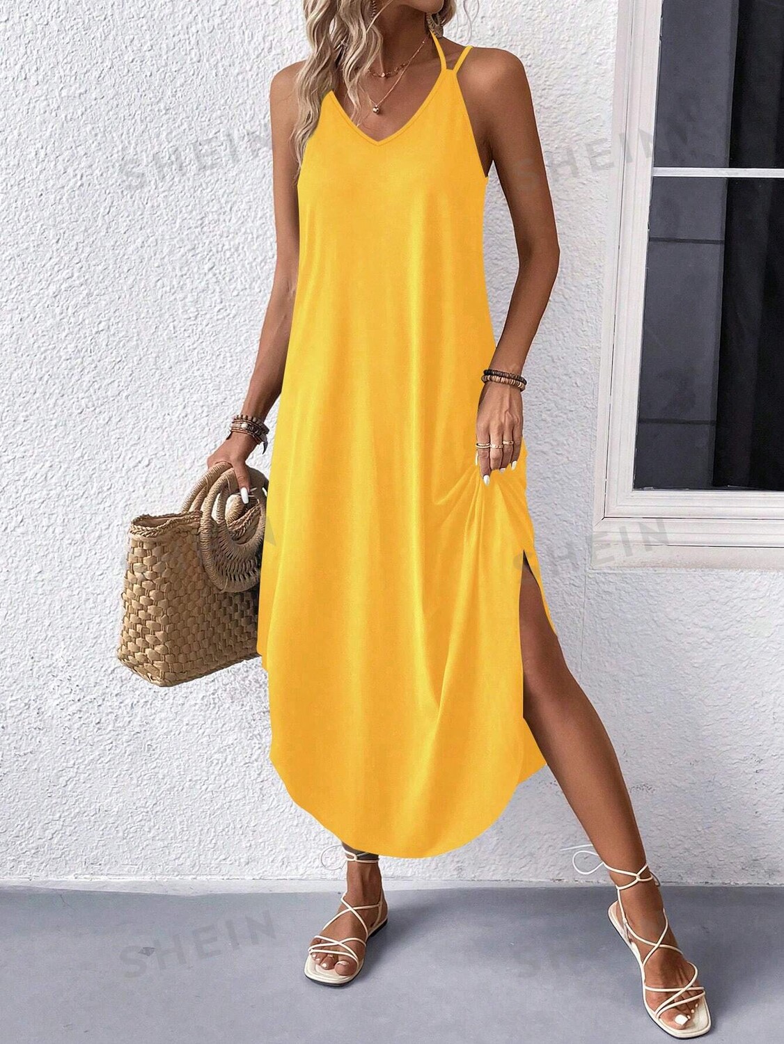 Женское однотонное платье на тонких бретельках с асимметричным подолом.